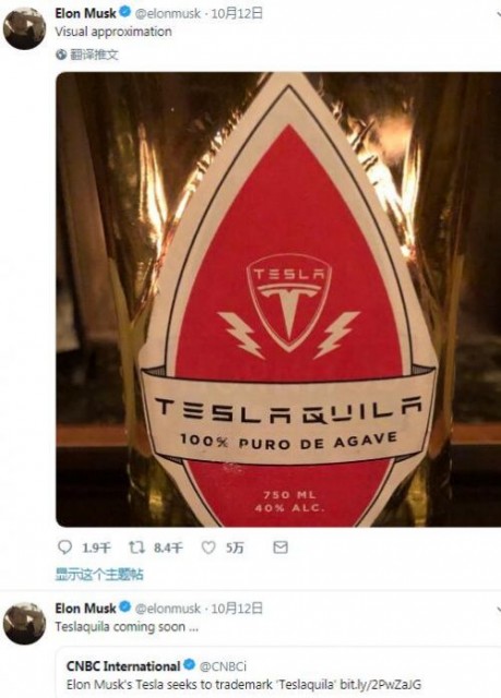 代理狮,据了解:10月14日消息,据外媒报道,特斯拉CEO马斯克正在申请特斯拉牌龙舌兰商标Teslaquilla(Tesla+tequilla)。美国财经媒体CNBC报道了相关新闻,马斯克转发并表示马上就会开售。他还发了一个特斯拉牌龙舌兰的样品,容量是750ML。